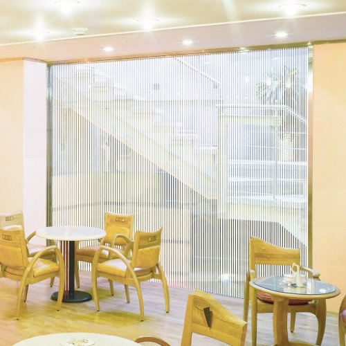 Blickdichte, 10 mm breite Streifen sind im Abstand von 4 mm auf die durchsichtige Folie gedruckt. Das bewirkt eine räumliche Trennung, erlaubt aber eine Teildurchsicht und lässt viel Licht herein.